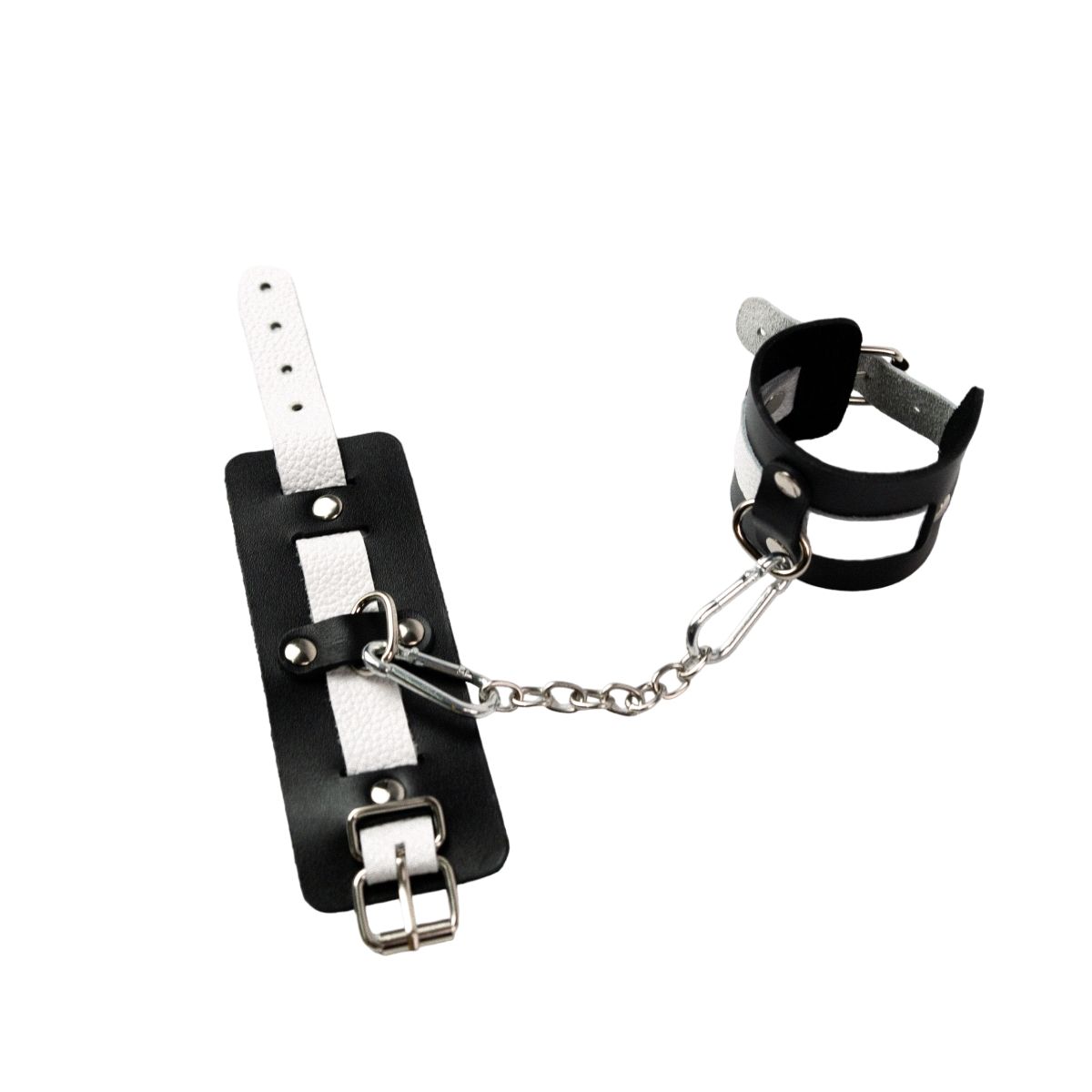 Оковы состоят из двух деталей: основа прямоугольной формы из натуральной кожи черного цвета и ремешок белого цвета с прочной хромированной фурнитурой в виде овального кольца. Расположение ремешка через прорези основной части является декоративным решением, а также служит для лучшей регулировки размера. В комплект входит соединительная цепочка с двумя карабинами. Общая длина - 32 см.