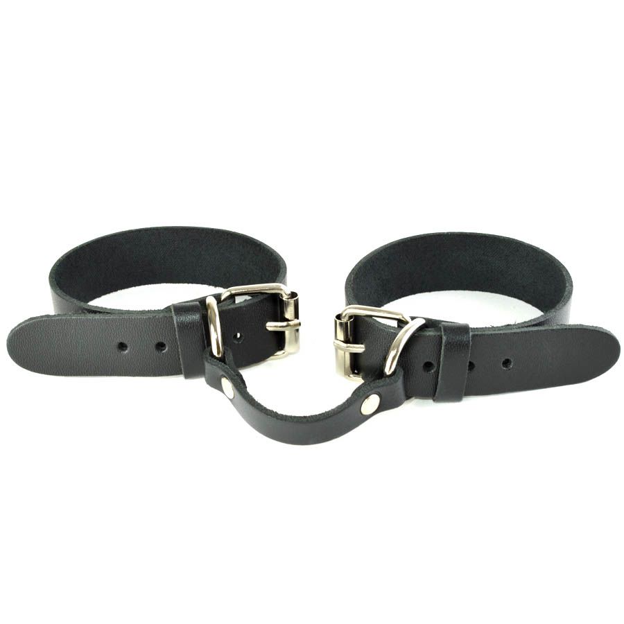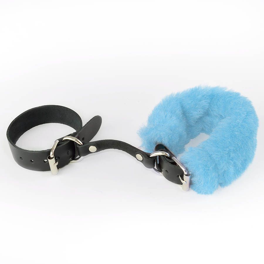 Черные кожаные наручники со съемной голубой опушкой