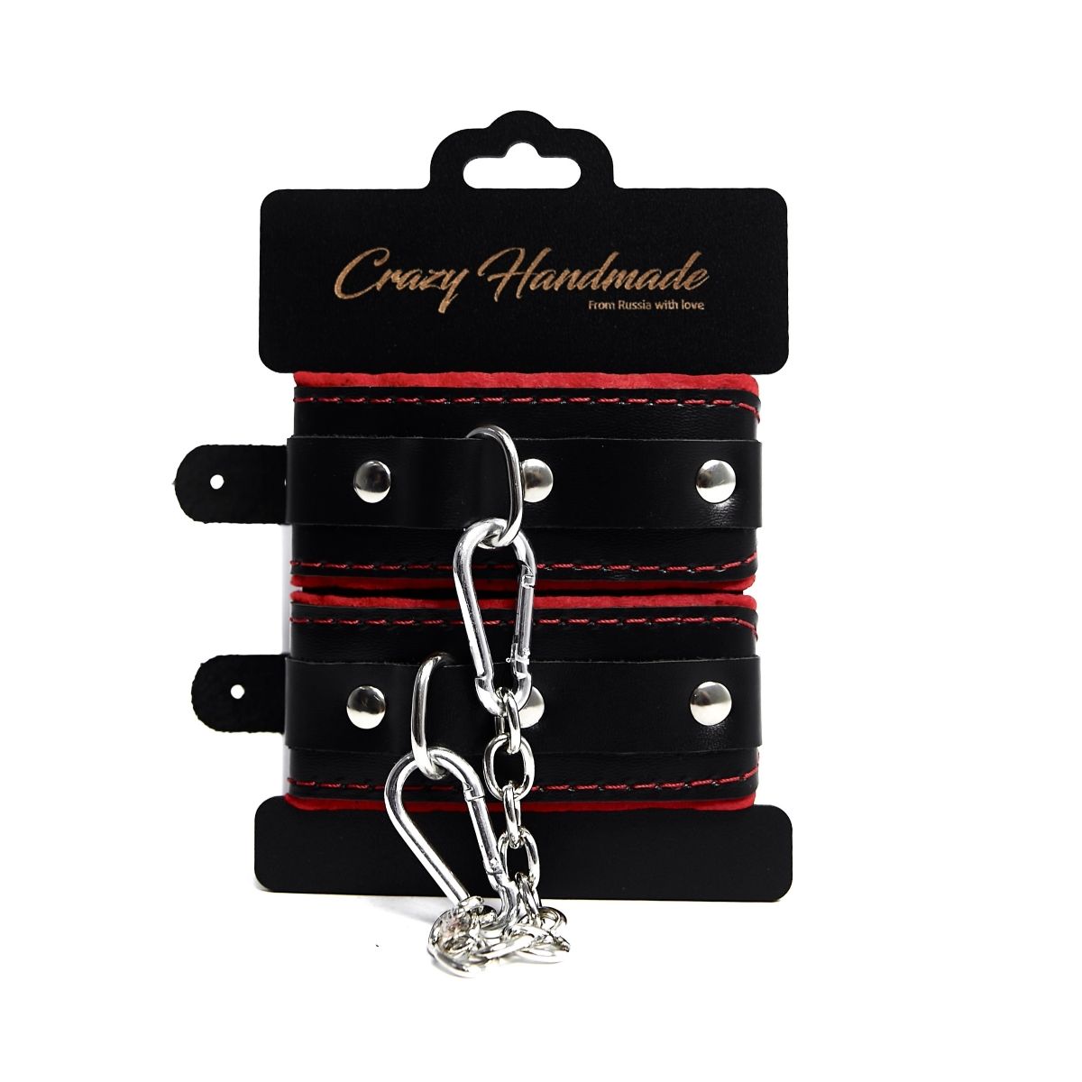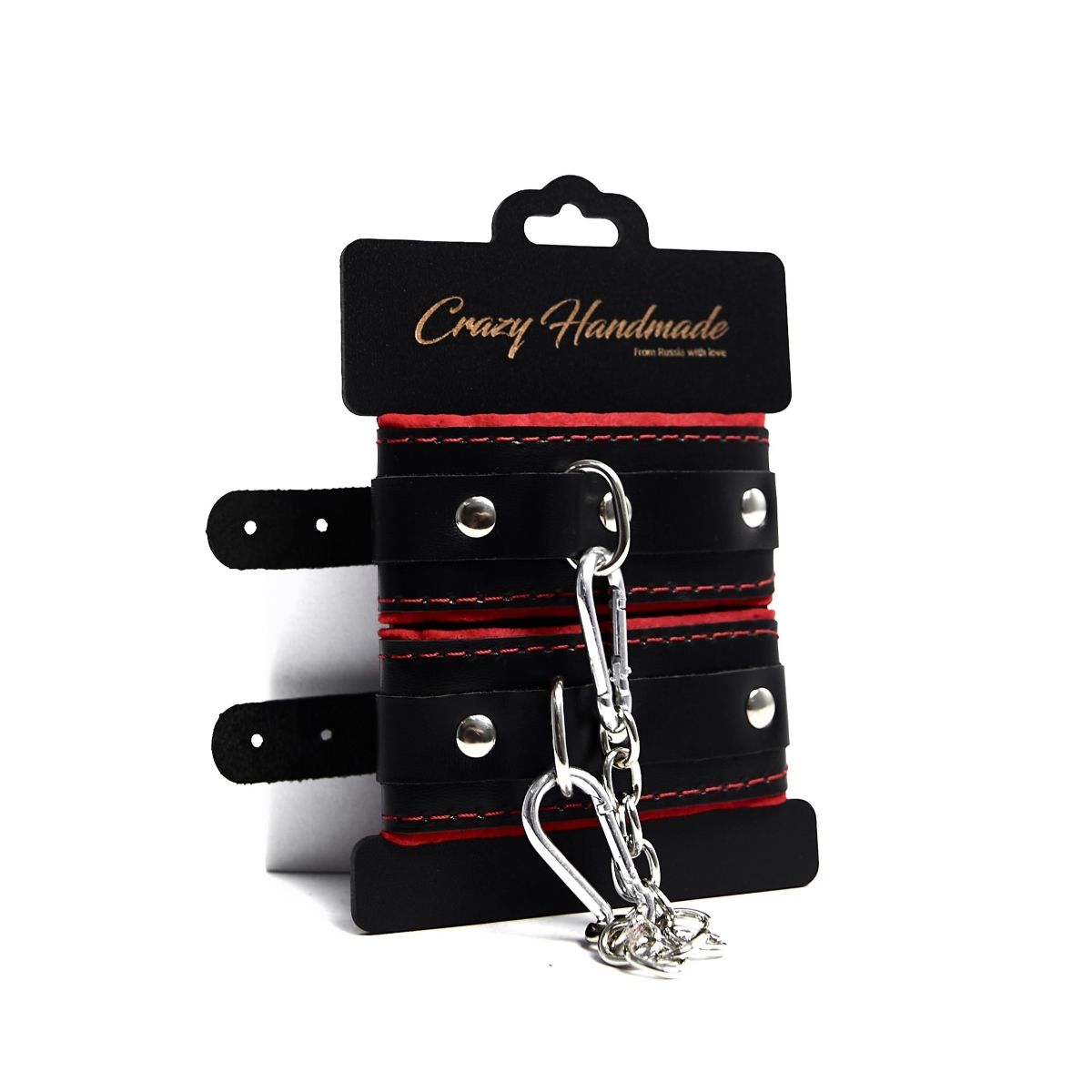 Черные наручники с красной подкладкой, строчками и скругленными ремешками