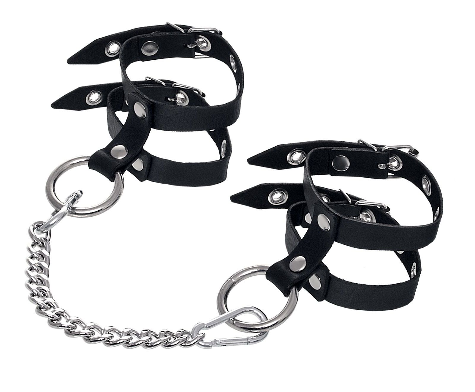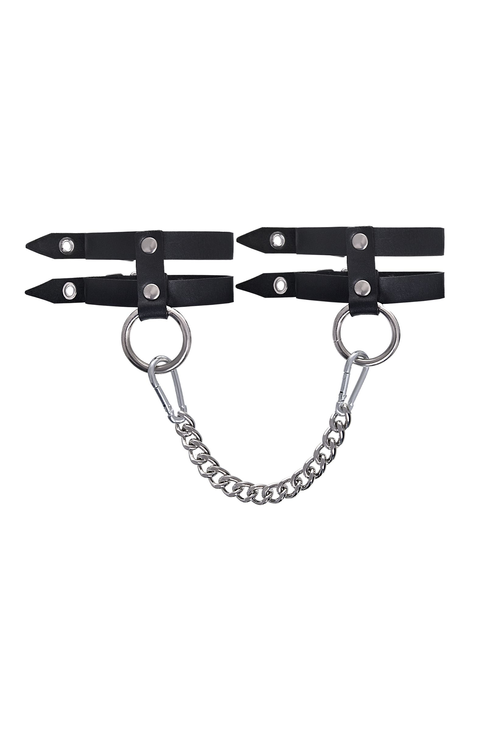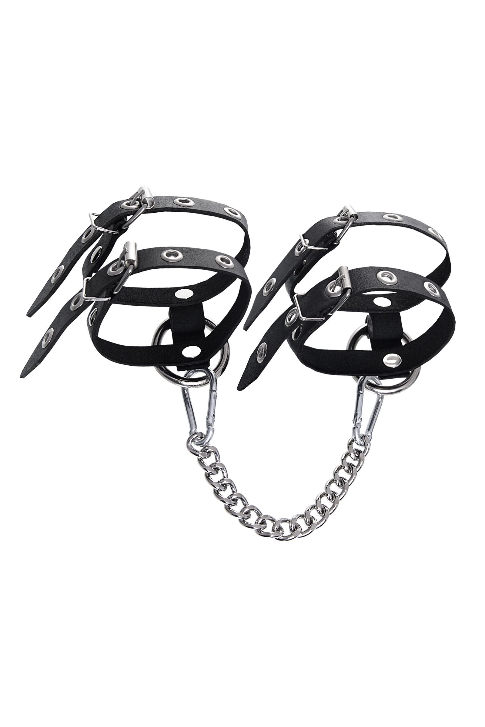 Наличие двух колец и карабинов, соединенных между собой металлической цепочкой, позволяет использовать изделие как раздельно – аксессуар-манжеты, так и как оковы для фиксации. К широким металлическим кольцам также можно присоединить и другие аксессуары при помощи карабинов.
