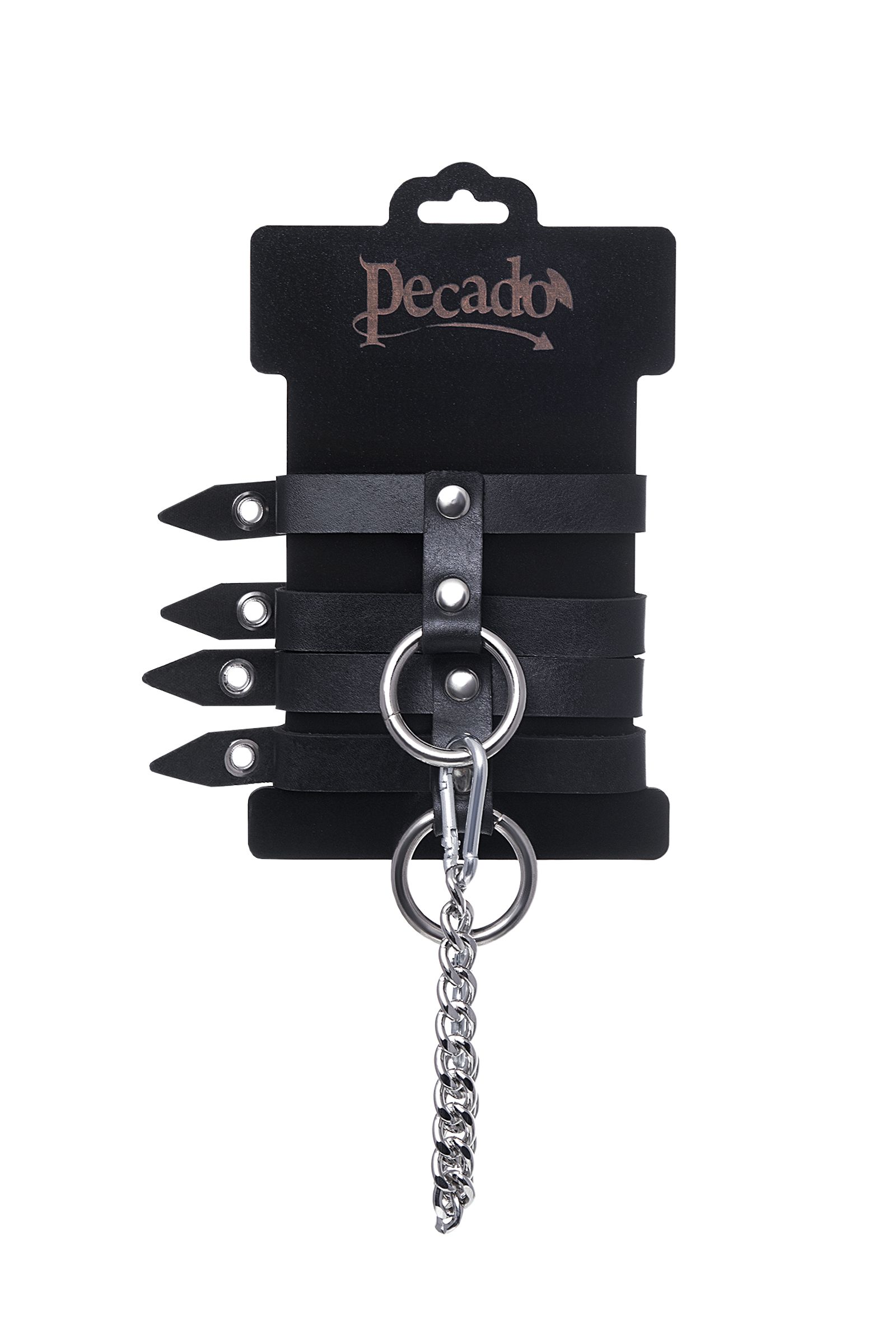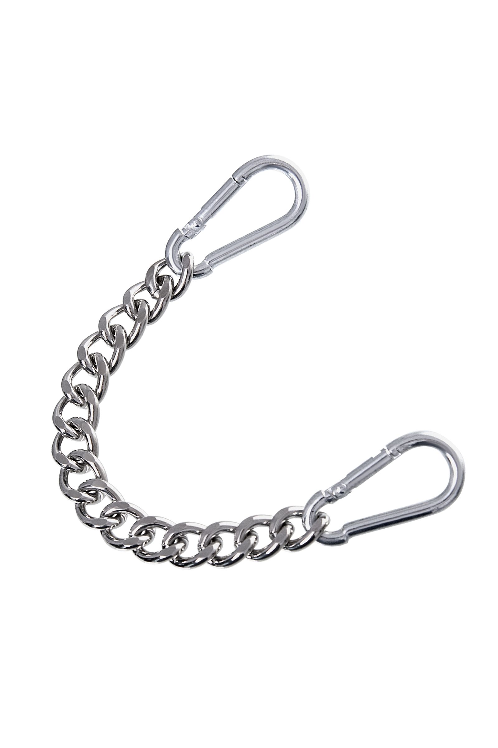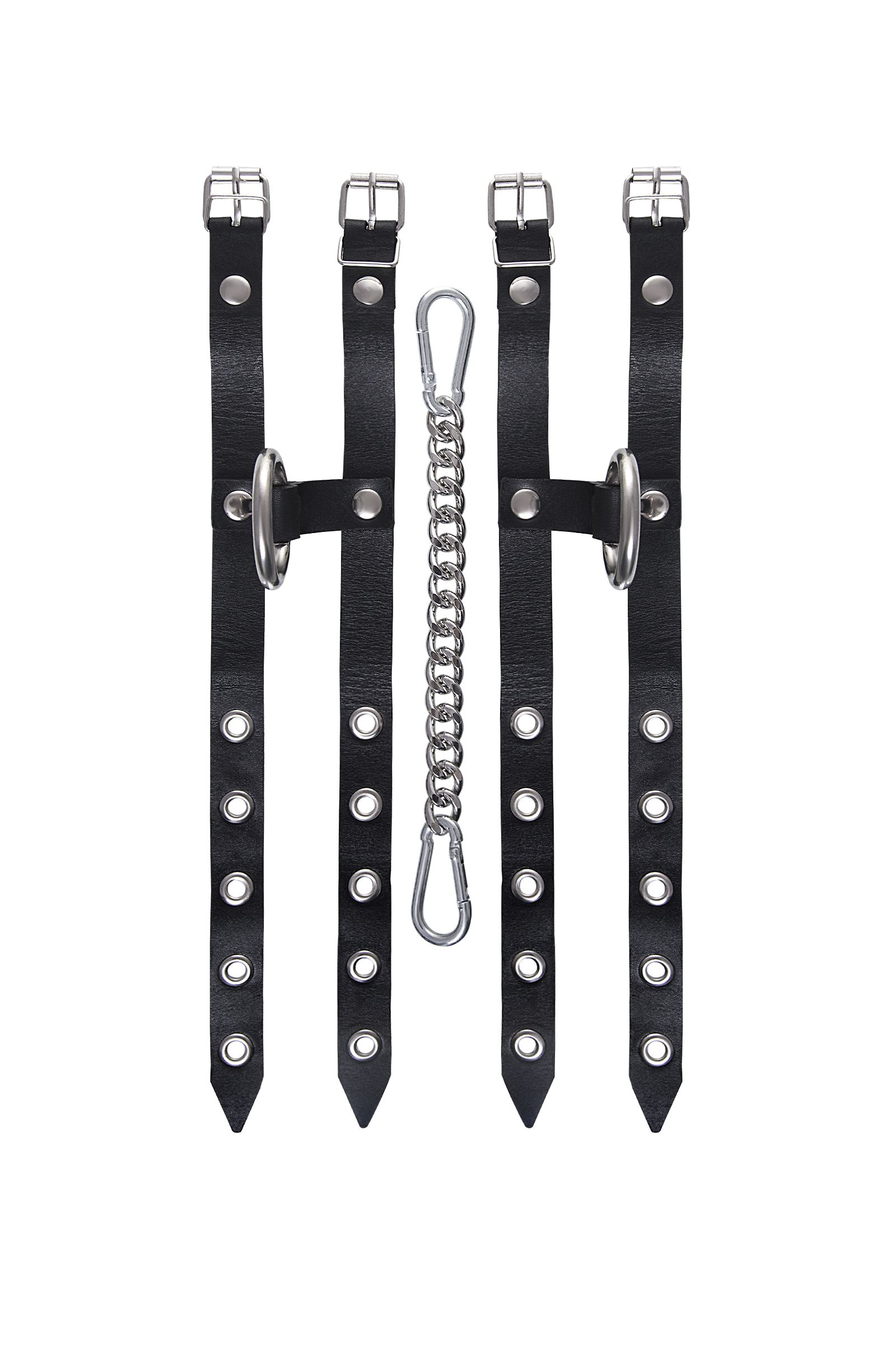 Наличие двух колец и карабинов, соединенных между собой металлической цепочкой, позволяет использовать изделие как раздельно – аксессуар-манжеты, так и как оковы для фиксации. К широким металлическим кольцам также можно присоединить и другие аксессуары при помощи карабинов.