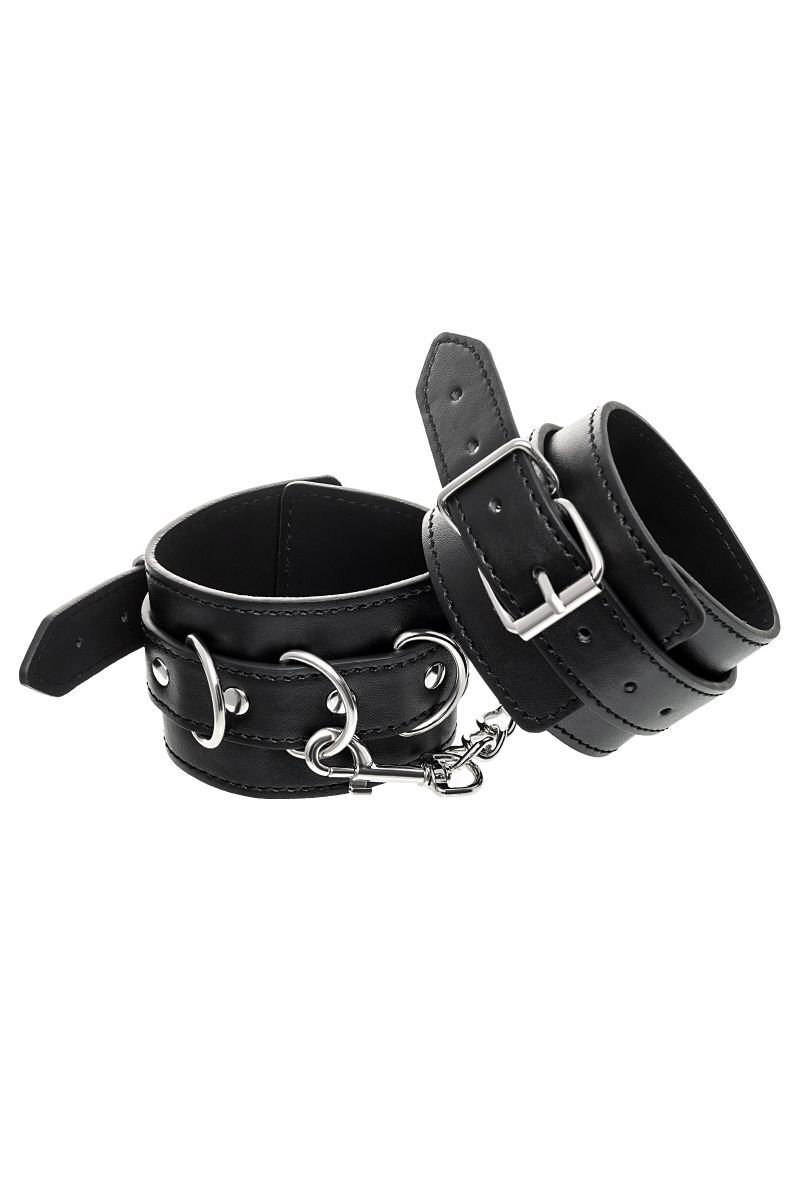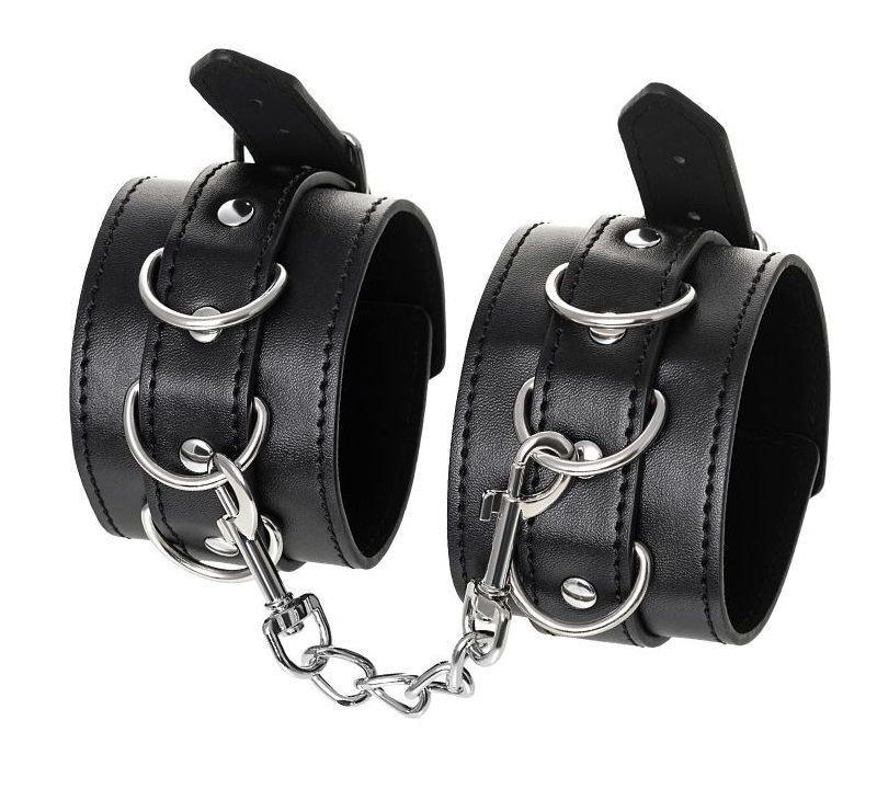 Черные оковы с металлической отделкой – брутальные ограничители свободы. К тому же, они на самом деле весьма жестко обхватывают ноги и надежно соединяют их между собой цепочкой на карабинах. Три кольца для крепления дают возможность дополнить поножи аксессуарами и использовать различные варианты фиксации. Длина оков позволяет использовать их практически на любой размер ног. Отрегулировать размер и силу обхвата легко с помощью ремешка и металлической пряжки. Черные оковы с металлической отделкой – это стиль и функционал. Теперь Доминант покажет, что значит грубое обращение и полный контроль над свободой. Ширина - 6 см.