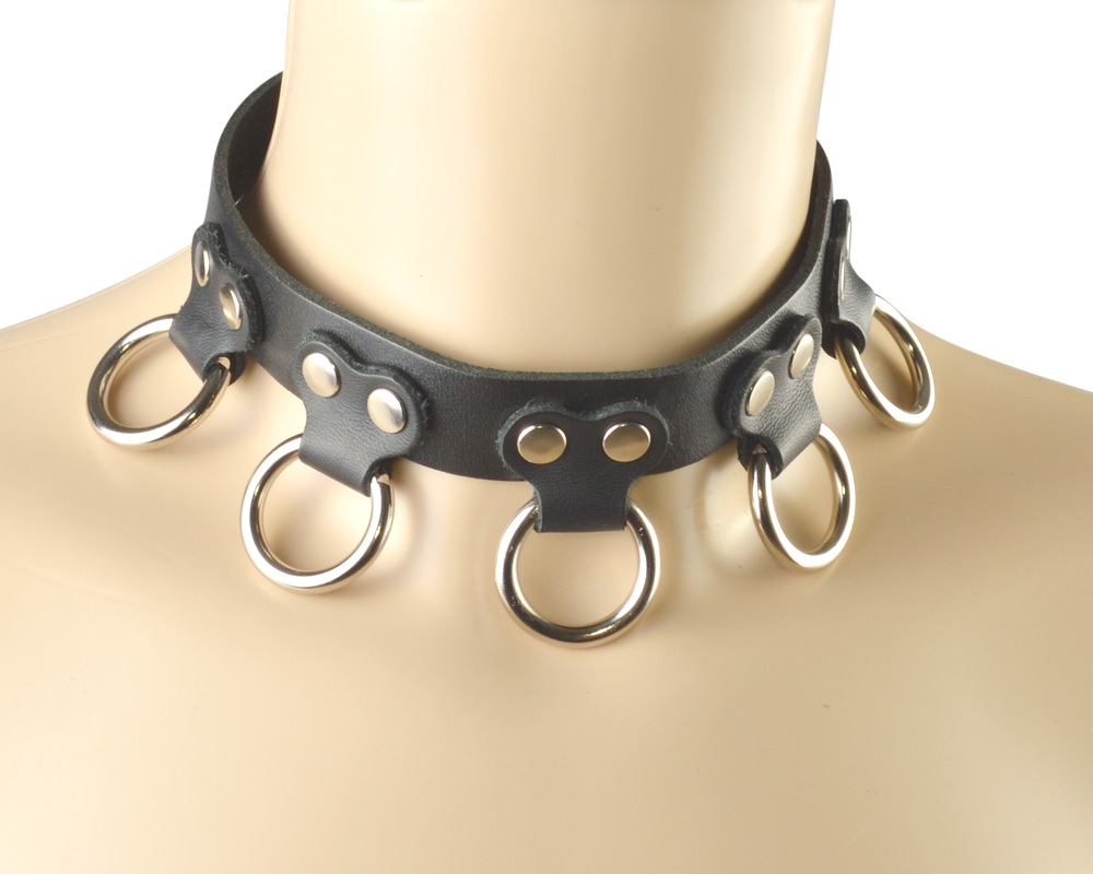 Стильный чокер изготовлен из натуральной кожи черного цвета с клепками и декорирован пятью металлическими кольцами. вся металлическая фурнитура имеет никелевое покрытие. регулируется при помощи кнопок. размер: длина чокера 40 см, ширина 2 см.цвет: черный.