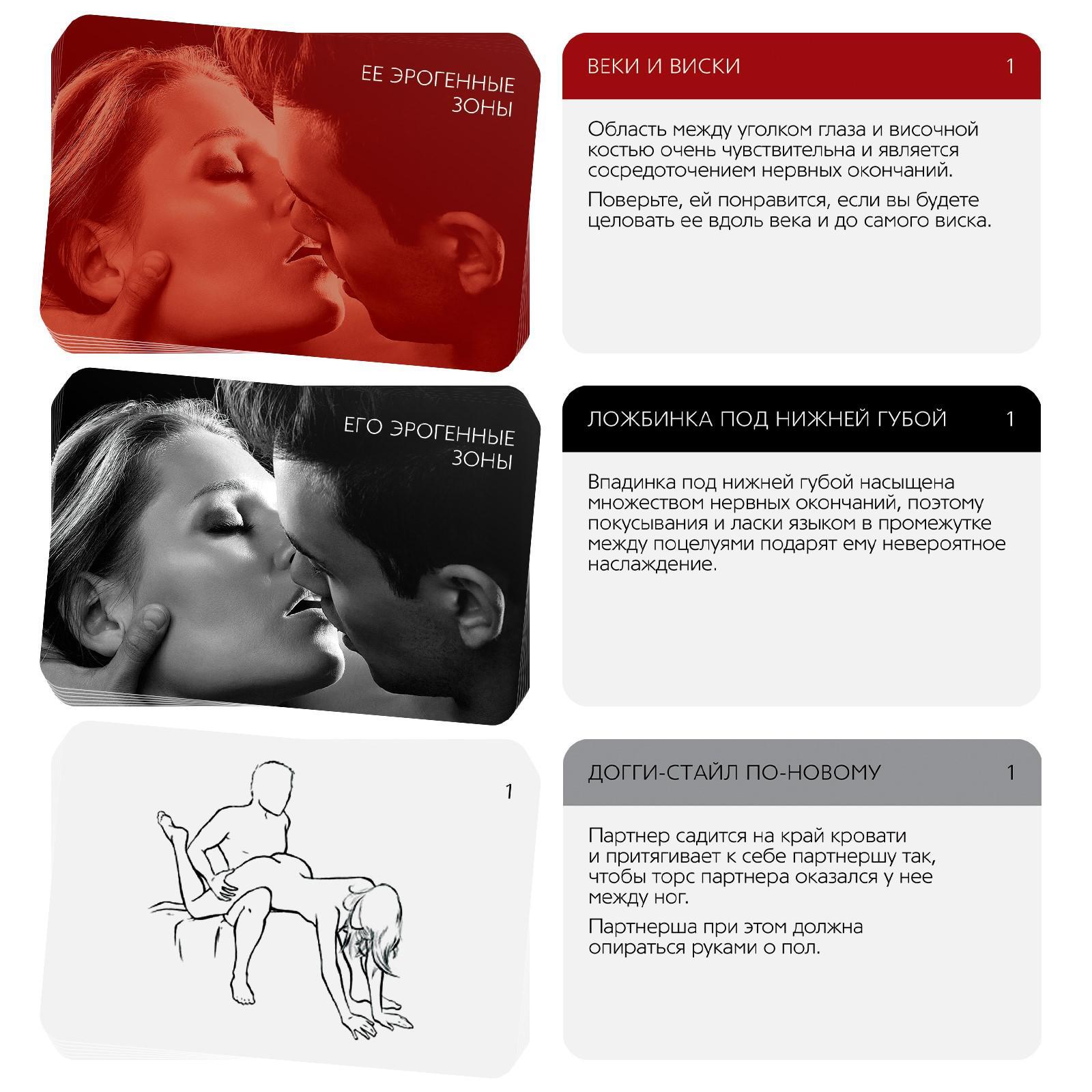 Что нужно делать? Разделите карты на 3 колоды: «Её эрогенные зоны», «Его эрогенные зоны» и «Позы». Определите, с чего вы начнёте игру: с изучения её или его эрогенных зон. Вытяните карточку и воспроизводите то, что там указано.