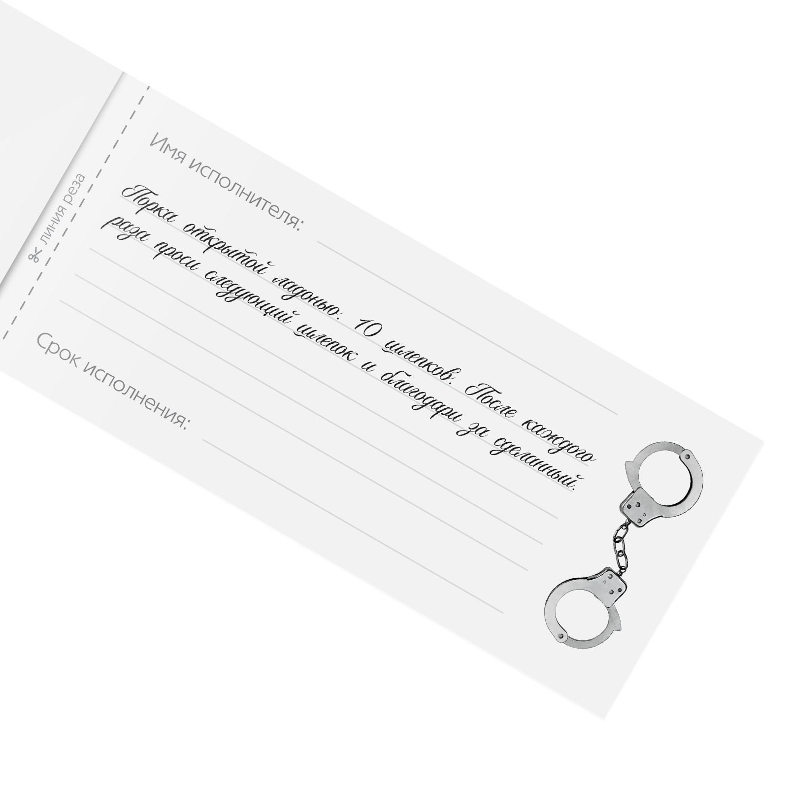 Горячие купоны для двоих. Купоны «Накажи меня» — это идеальный инструмент управления вашим партнёром. Выписывайте чеки и наслаждайтесь воплощением ваших тайных фантазий вместе! Как использовать купоны? Изучите книжку и выберите задания, которые понравились вам больше всего. На каждом купоне необходимо указать имя исполнителя и срок исполнения наказания. Осталось только вручить чек и ждать. Внутри вы найдёте: 20 чеков. Дарите друг другу наслаждение! В комплекте: 20 купонов.