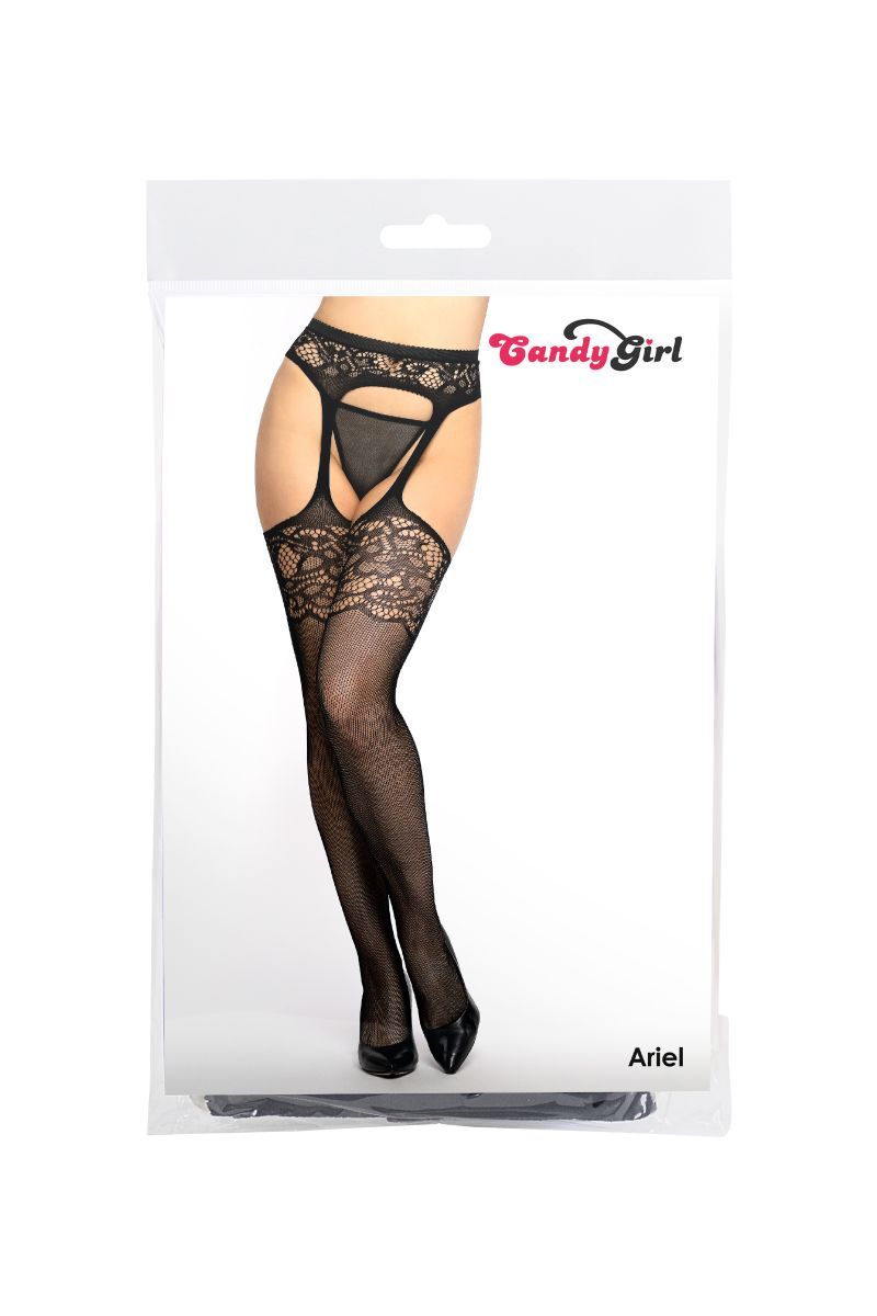 Чулки с поясом и стринги Candy Girl Ariel выполнены из сетки равномерного плетения с ажурными вставками. Эластичные чулки подчеркивают стройность, а пажи и пояс с высокой посадкой зрительно удлиняют ноги и акцентируют внимание на ягодицах. Кружевные пояс и резинки чулок превращают классические чулки из сетки в роскошный аксессуар. Усиленные носочки дарят комфорт при использовании. В комплекте трусики-стринги. В комплекте: чулки на поясе, трусики-стринги.