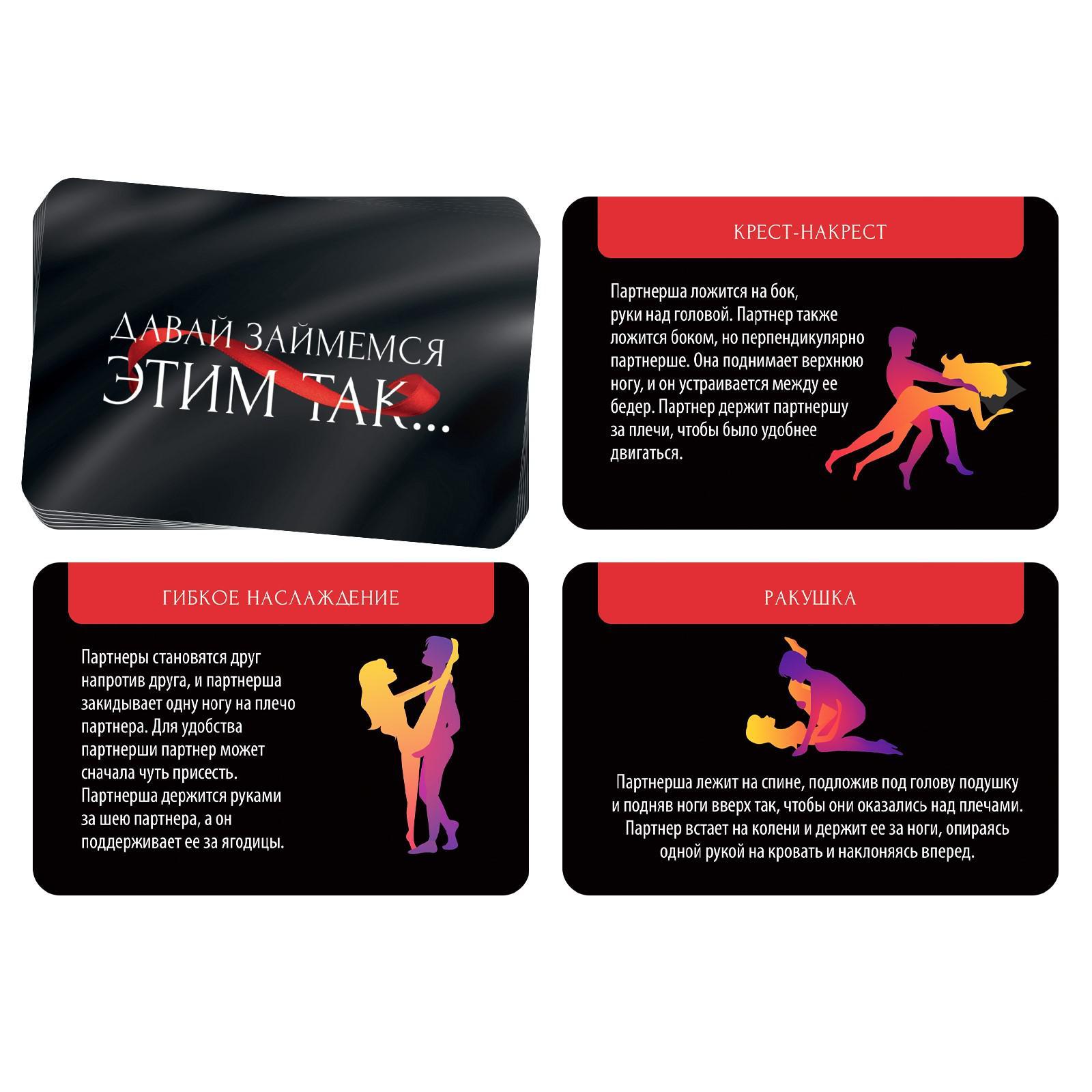 В этой коробке вас ждёт 20 самых возбуждающих эротических поз. Хотите попробовать что-то новое и необычное? Тогда эти фанты — именно то, что вам нужно. Рассматривайте карточки, выбирайте понравившиеся позы и дарите друг другу наслаждение.