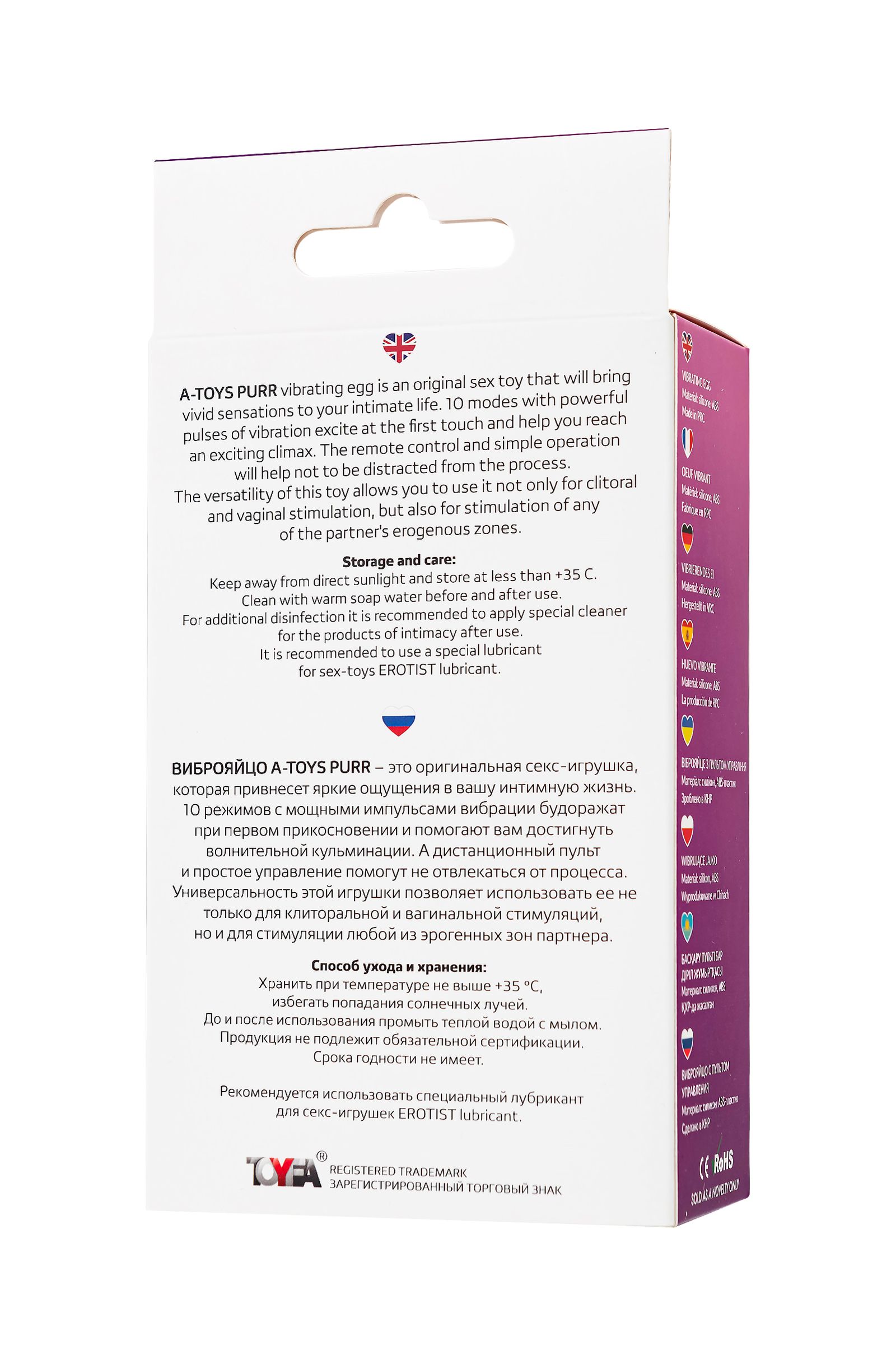 Виброяйцо A-Toys Purr – это оригинальная секс-игрушка, которая привнесет яркие ощущения в вашу интимную жизнь.10 режимов с мощными импульсами вибрации будоражат при первом прикосновении и помогают подвести партнера к волнительной кульминации. А дистанционный пульт и простое управление помогут не отвлекаться от процесса. Универсальность этой игрушки позволяет использовать ее не только для клиторальной и вагинальной стимуляций, но и для стимуляции любой из эрогенных зон партнера. Рабочая длина - 7,5 см.