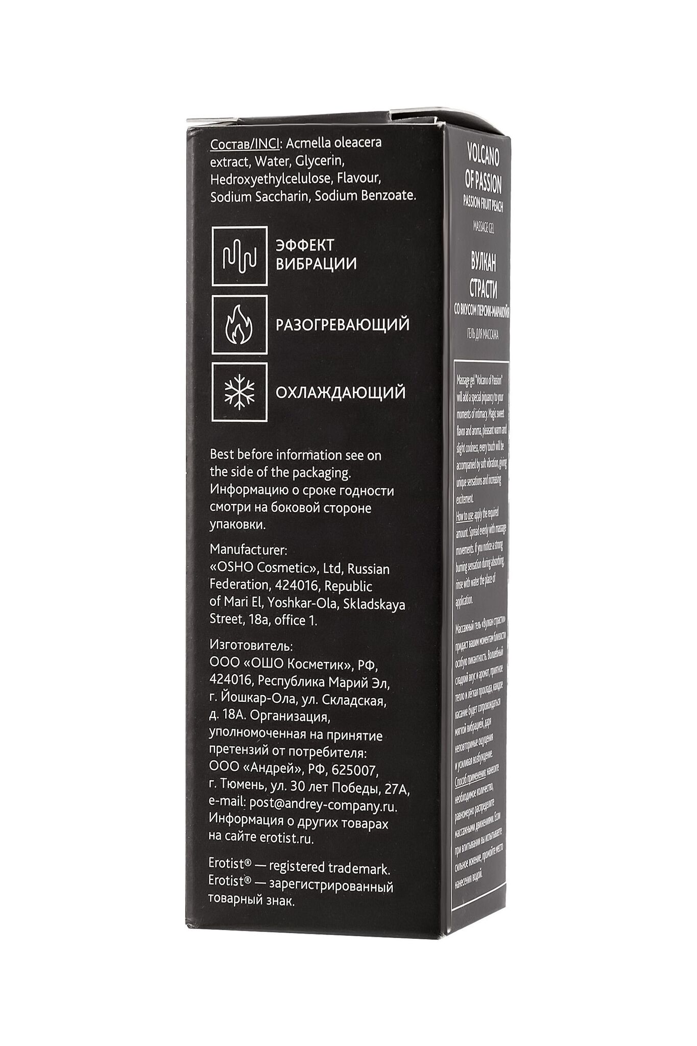 Массажный гель «Вулкан страсти» придаст вашим моментам близости особую пикантность. Волшебный сладкий вкус и аромат, приятное тепло и лёгкая прохлада, каждое касание будет сопровождаться мягкой вибрацией, даря неповторимые ощущения и усиливая возбуждение. Нанесите немного жидкого геля на интимные зоны, и через несколько секунд вы почувствуете тепло, затем в течение 2-3 минут легкую вибрацию и легкий холодок. Длительность эффекта зависит от особенностей вашего организма. Гель с вибрирующим эффектом для интимных зон на основе натуральных ингредиентов, без парабенов. Вкус и аромат персик-маракуйя. Подходит для поцелуев и орального секса.