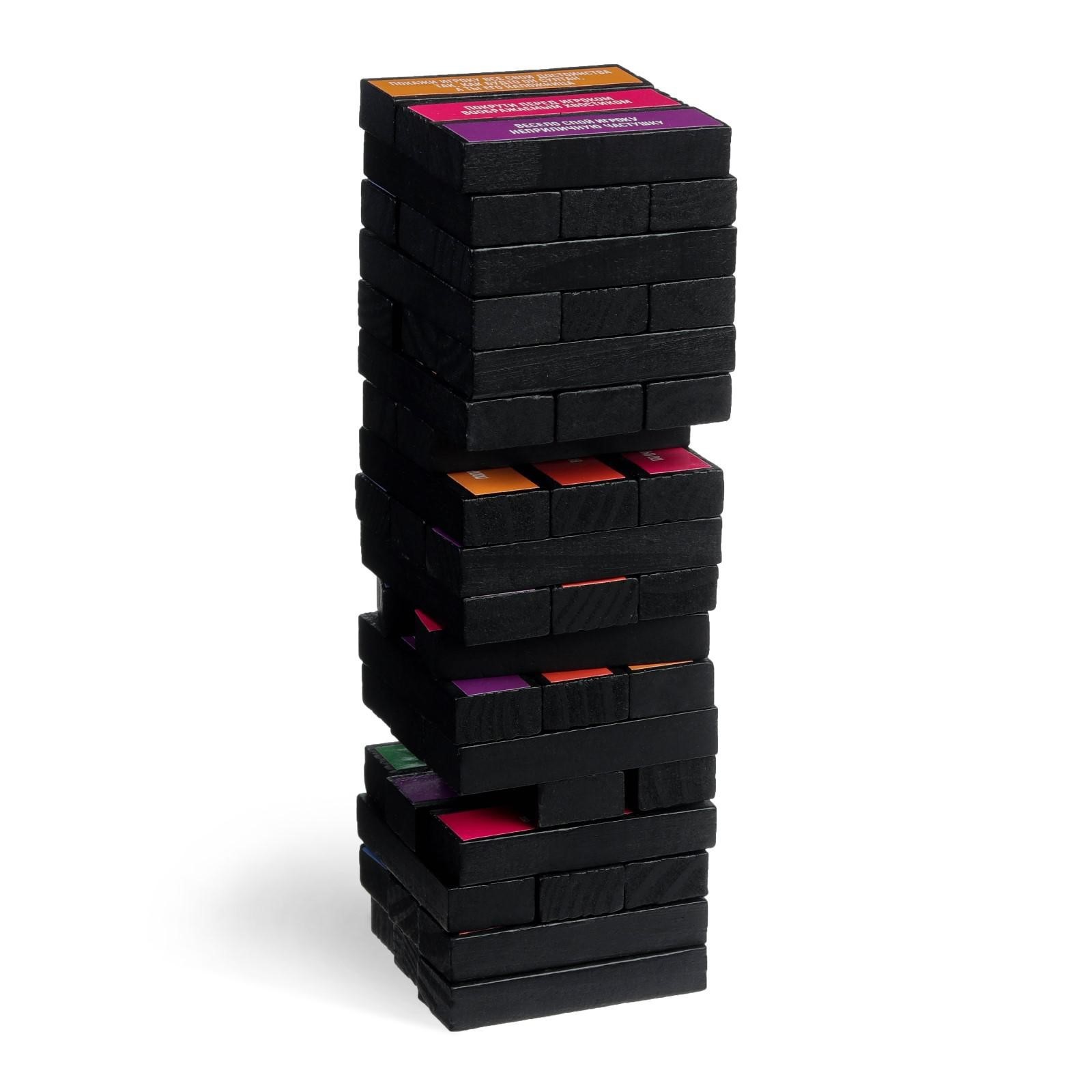 Неожиданные задания разнообразят любой праздник! Каждое написано на фоне определённого цвета (всего их шесть). Перед началом игры распределите цвета между игроками. Постройте башню и вытягивайте бруски так, чтобы она не упала. Тот, кто вытянул деталь, зачитывает задание и выполняет его с тем игроком, чей цвет указан на бруске. Вас ждут веселье, много смеха и пикантных подробностей — устоять просто невозможно! Победит тот, кто вытягивал последним до того, как «постройка» развалится!
