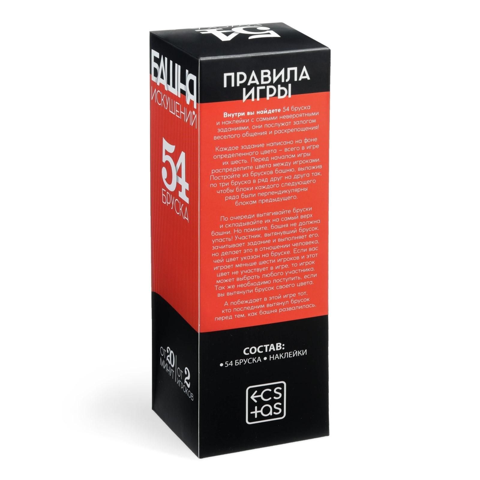 Устройте вечеринку, будоражащую ваше воображение! Постройте падающую башню, позовите друзей и выполняйте пикантные задания! В наборе вы найдёте 54 деревянных бруска с фантами, способными поднять настроение каждому! «Башня искушений» — залог общения и раскрепощения!