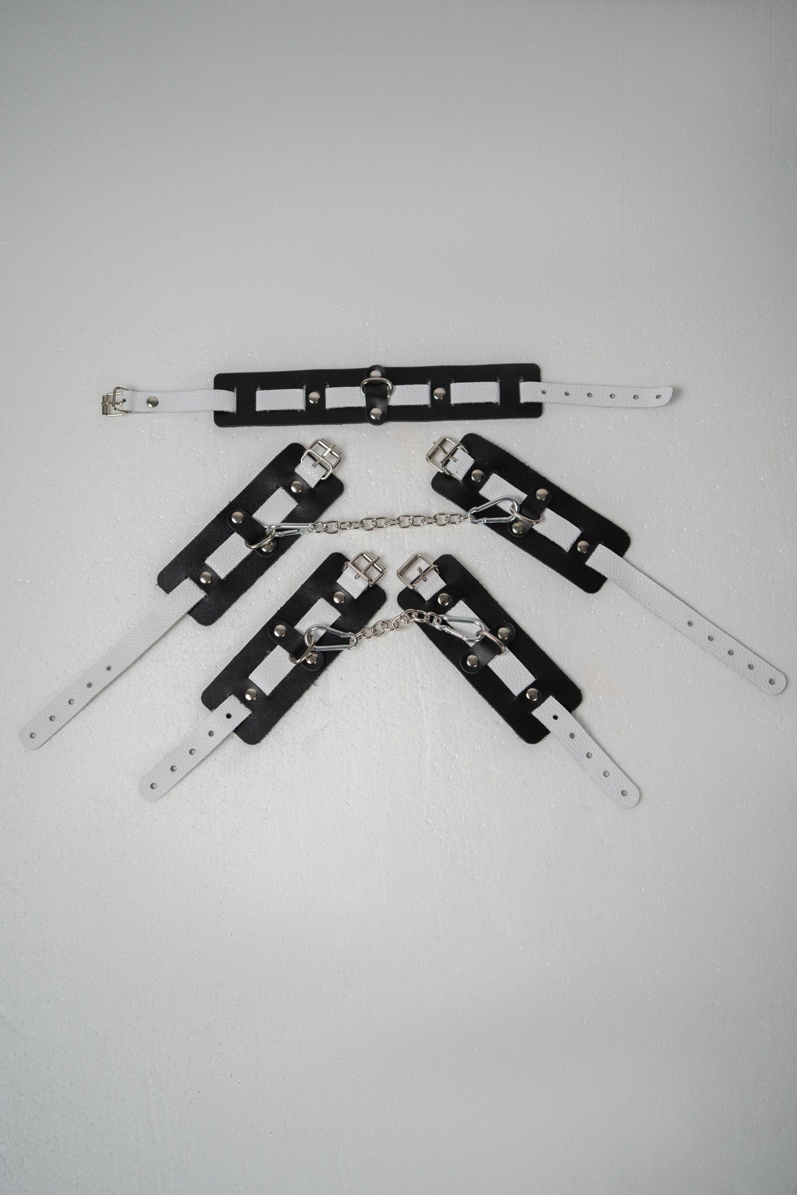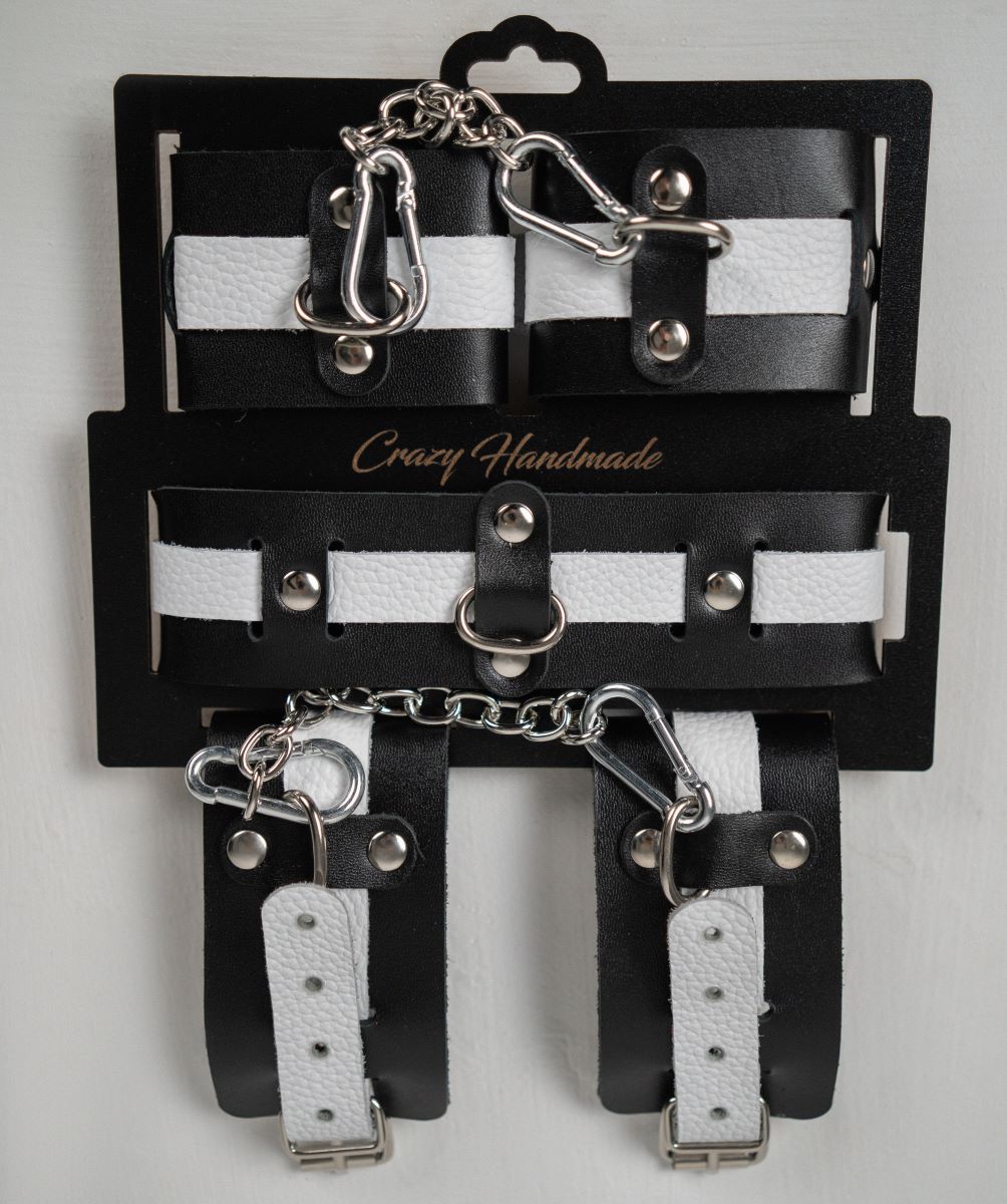 Наручники состоят из двух деталей: основа прямоугольной формы из натуральной кожи черного цвета и ремешок белого цвета с прочной хромированной фурнитурой в виде овального кольца. Расположение ремешка через прорези основной части является декоративным решением, а также служит для лучшей регулировки размера. В комплект входит соединительная цепочка с двумя карабинами.