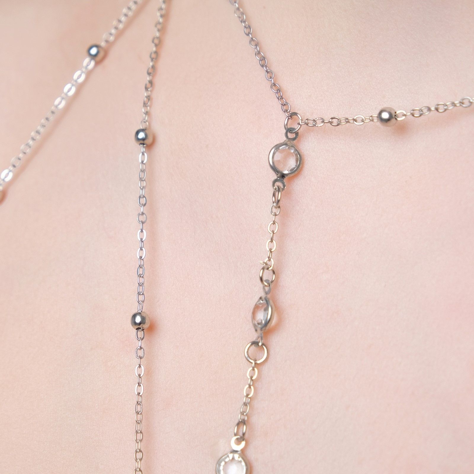 Украшение выполнено из металлических цепочек, оригинально расположенных между собой. Металлические бусинки чередуются с стразами и тонкими колечками на тонкой цепочки.