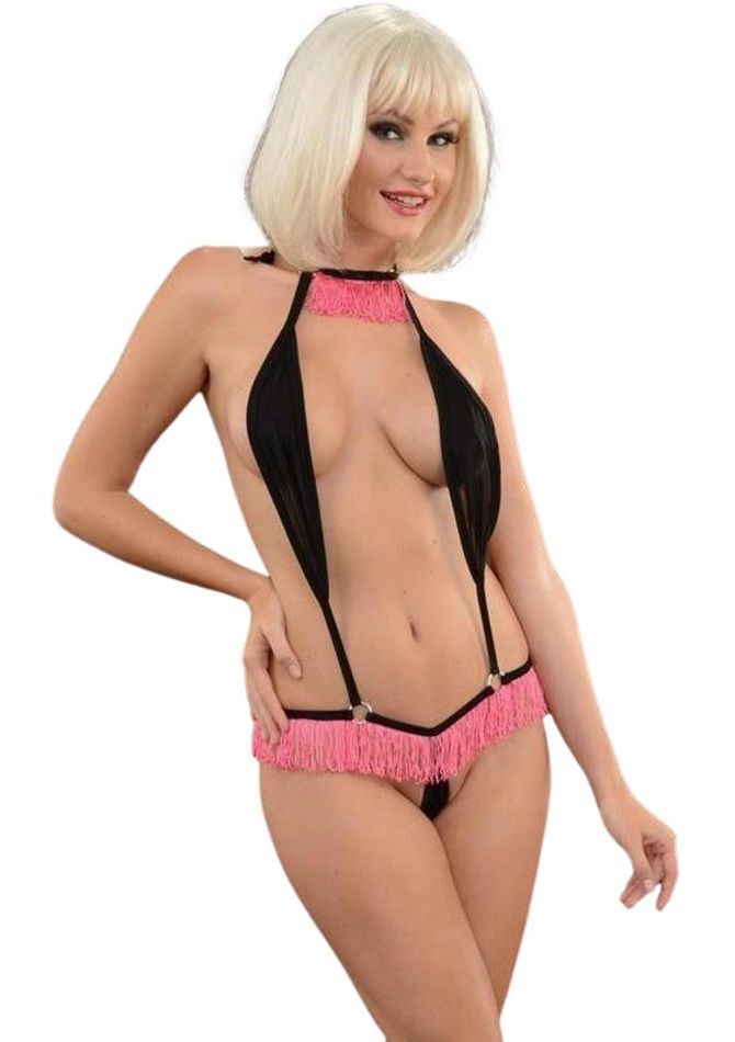Оригинальное боди с розовой бахромой на шее и бёдрах