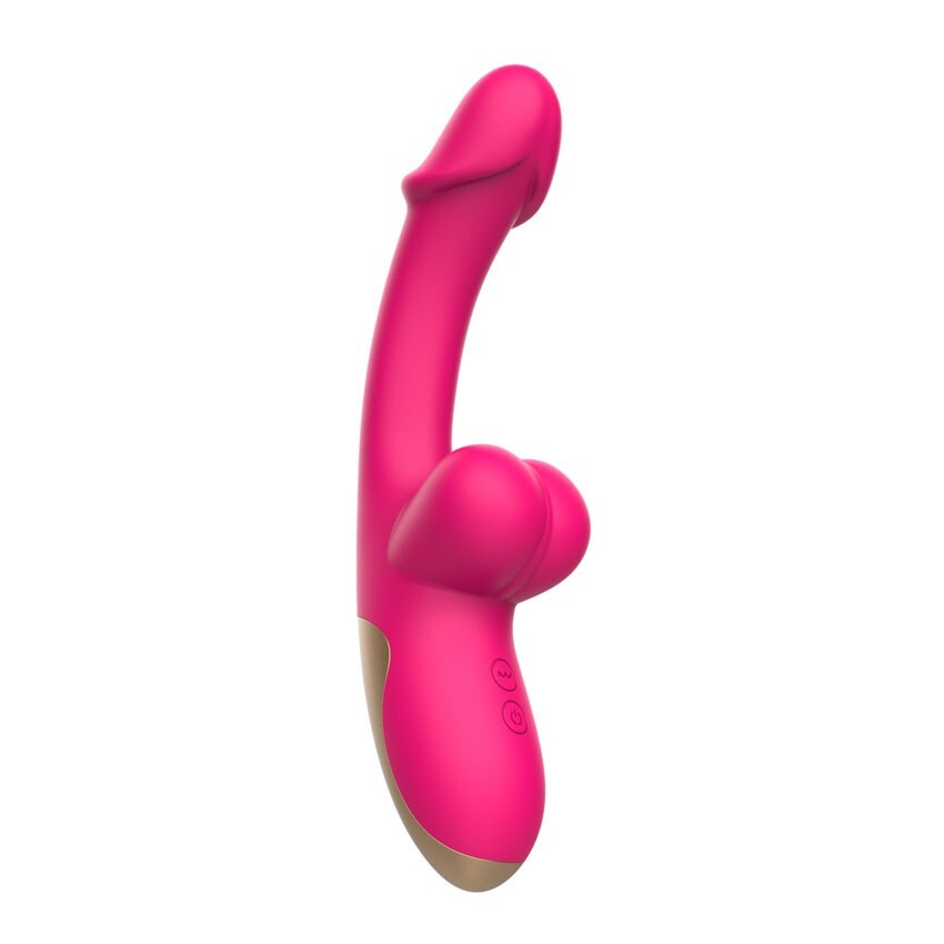 Розовый изогнутый вибромассажёр с имитацией мошонки - 20,4 см.