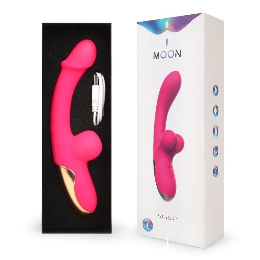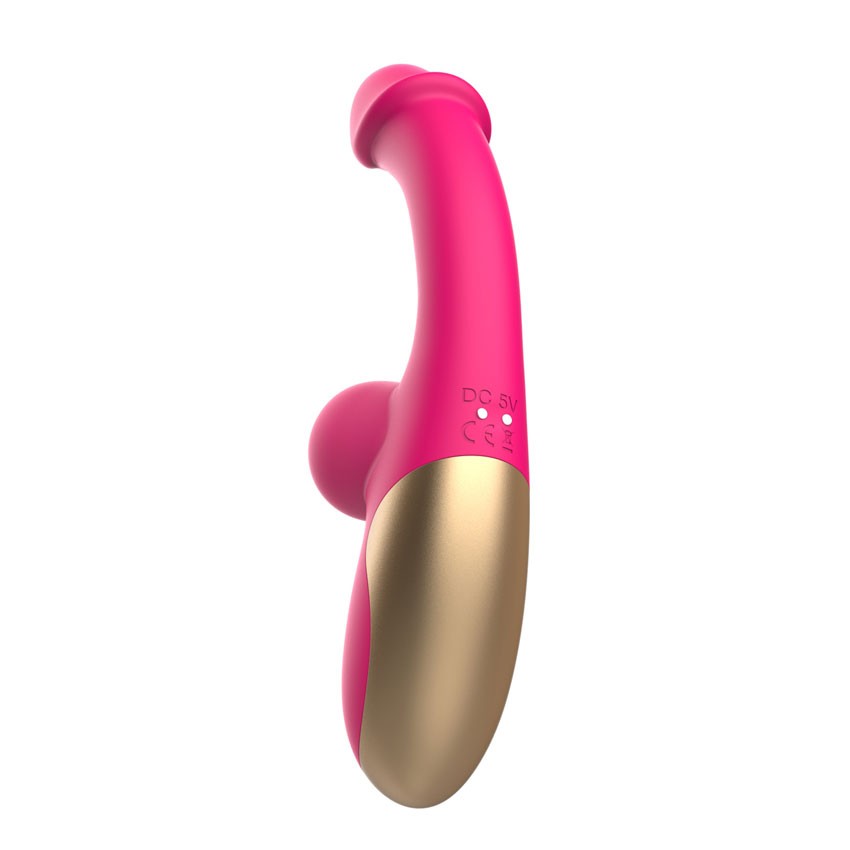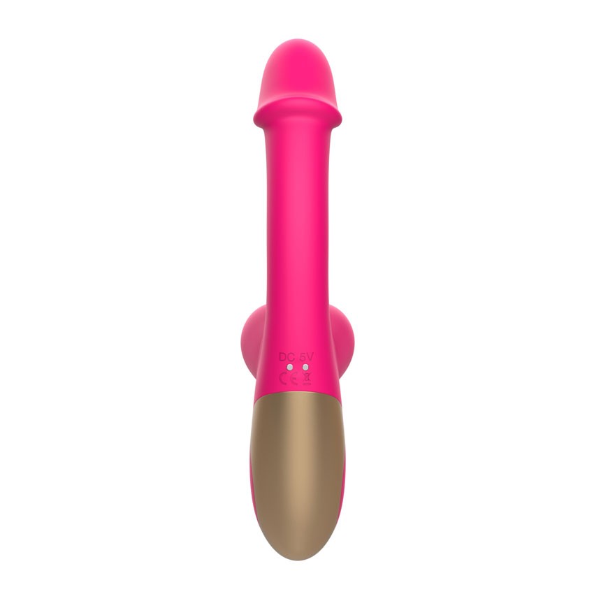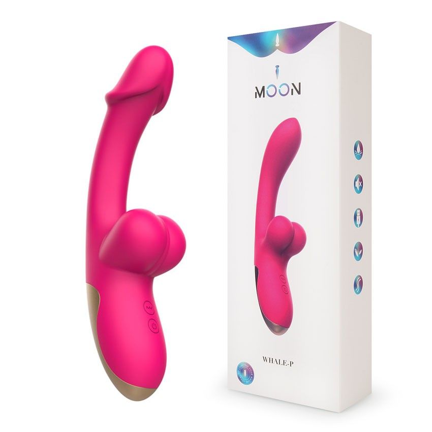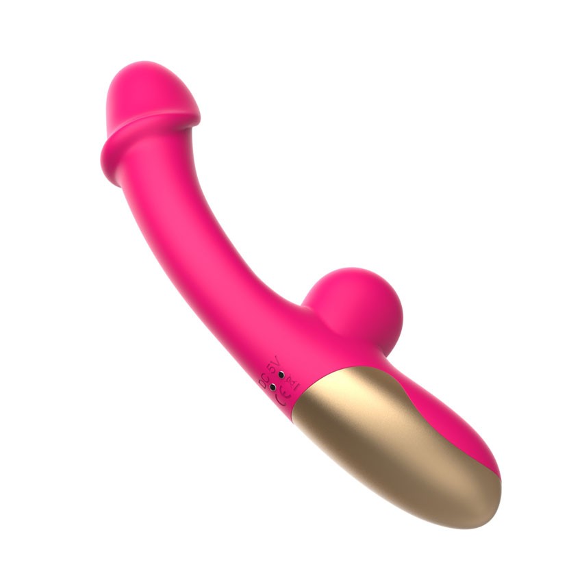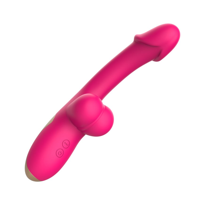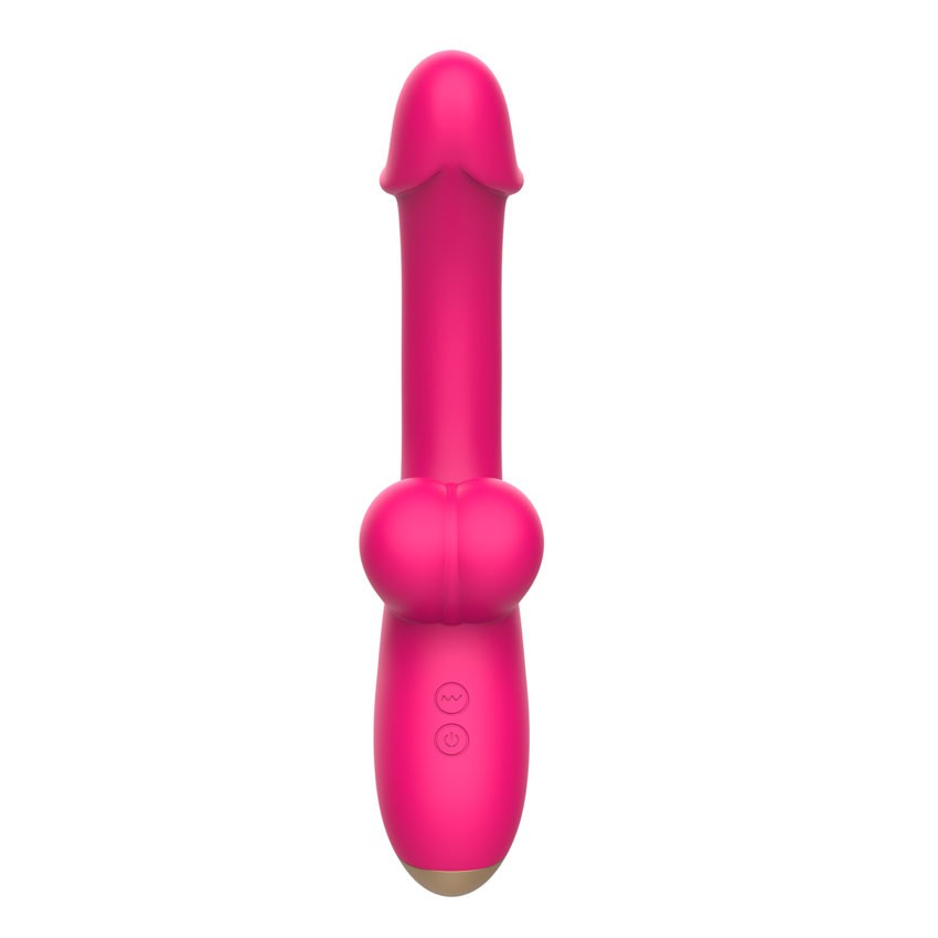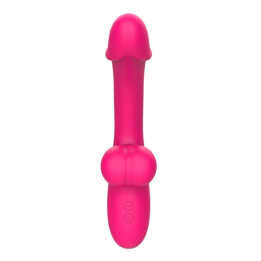 Розовый изогнутый вибромассажёр с имитацией мошонки - 20,4 см.
