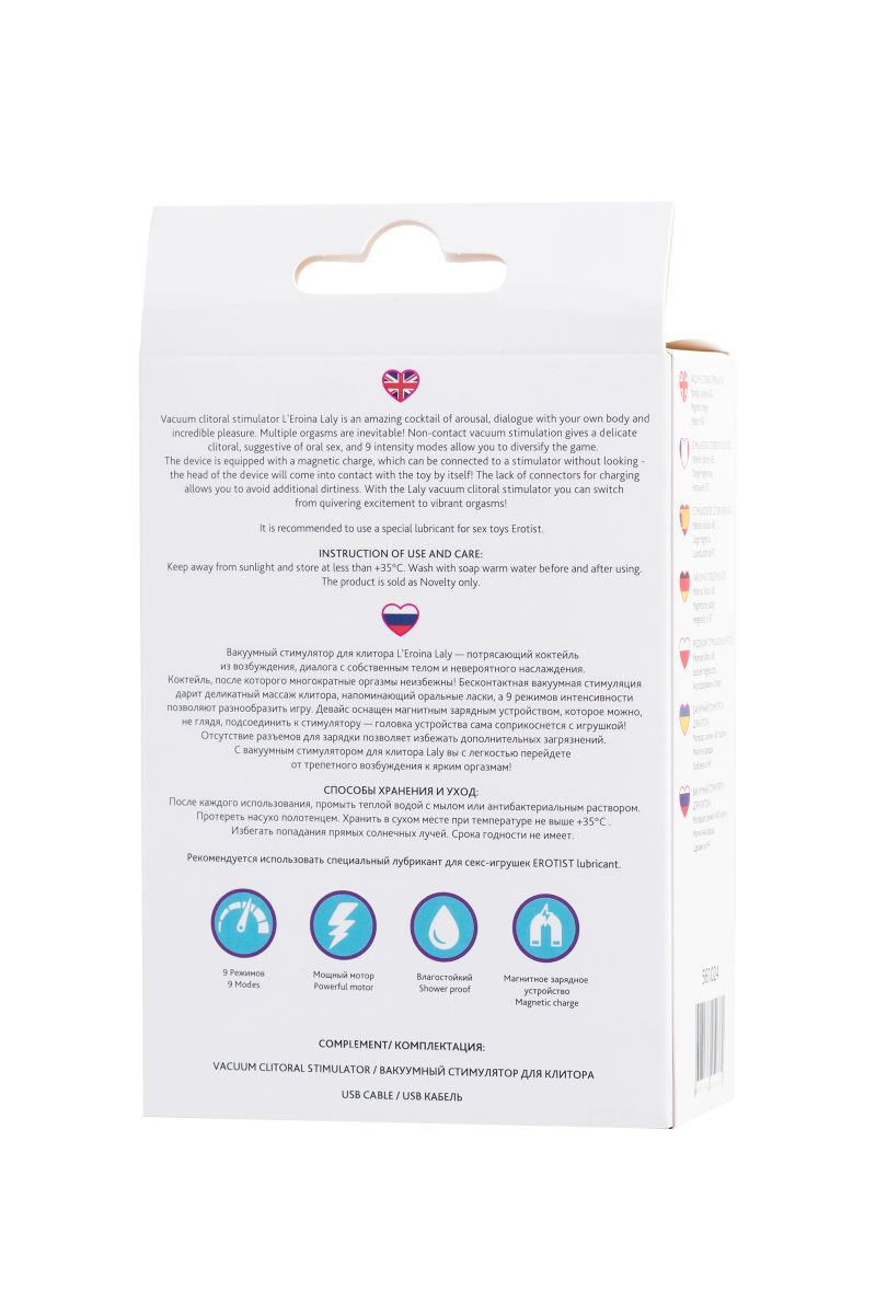 Девайс оснащен магнитным зарядным устройством, которое можно, не глядя, подсоединить к стимулятору — головка устройства сама соприкоснется с игрушкой! Отсутствие разъемов для зарядки позволяет избежать дополнительных загрязнений. С вакуумным стимулятором для клитора Laly вы с легкостью перейдете от трепетного возбуждения к ярким оргазмам! Уровень шума менее 50 dB. Время зарядки - 2 часа.