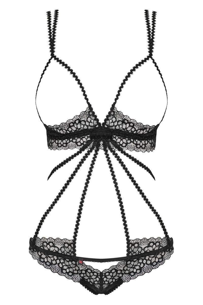 Страстное боди с открытой грудью и промежностью для горячей ночи. Изготовлено из кружева с цветочным орнаментом и тонких эластичных тесемок. Двойные бретели регулируются по длине, сзади застежка на крючок. Декоративные украшения с маленькими кристаллами украшают боди на спинке.