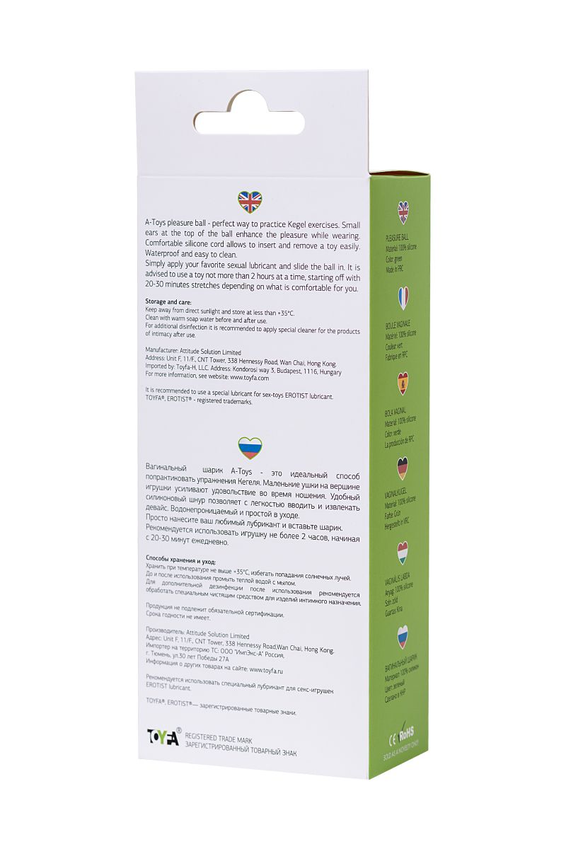 Вагинальный шарик A-Toys — это идеальный способ попрактиковать упражнения Кегеля. Маленькие ушки на вершине игрушки усиливают удовольствие во время ношения. Удобный силиконовый шнур позволяет с легкостью вводить и извлекать девайс. Водонепроницаемый и простой в уходе. Просто нанесите ваш любимый лубрикант и вставьте шарик. Рекомендуется использовать игрушку не более 2 часов, начиная с 20-30 минут ежедневно. Рабочая длина - 2,9 см.